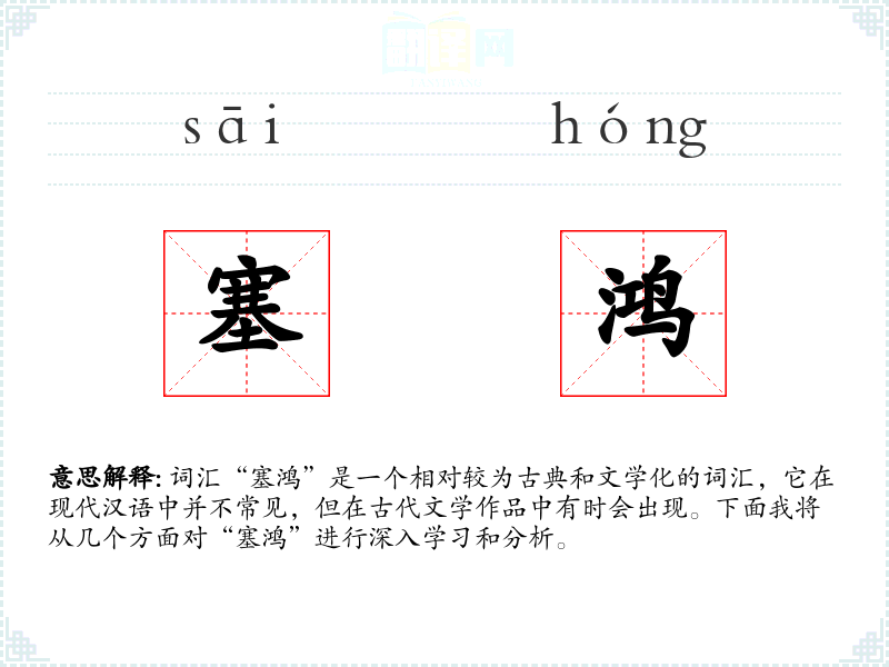 词汇“塞鸿”是一个相对较为古典和文学化的词汇,它在现代汉语中并不常见,但在古代文学作品中有时会出现。下面我将从几个方面对“塞鸿”进行深入学*和分析。