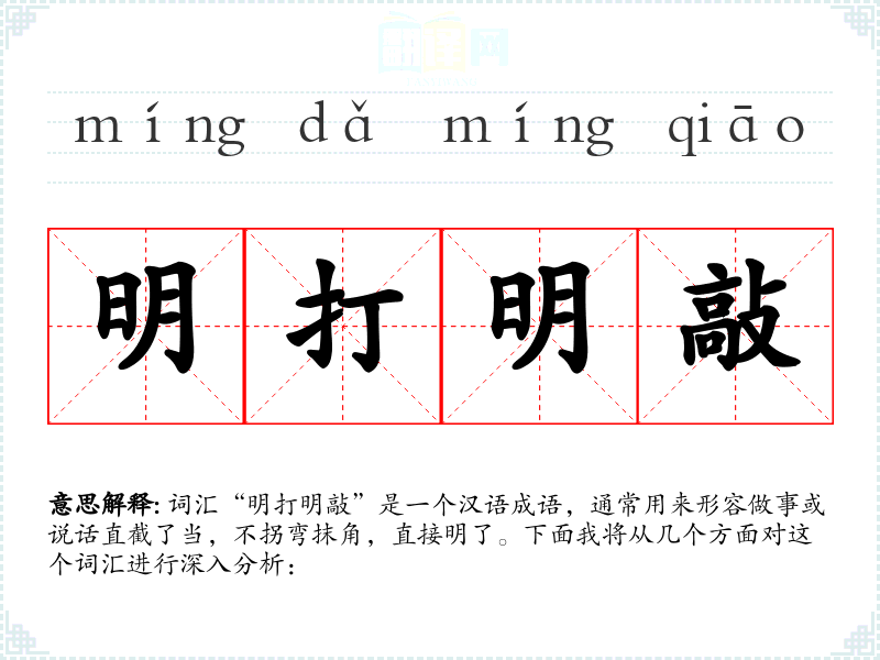 词汇“明打明敲”是一个汉语成语,通常用来形容做事或说话直截了当,不拐弯抹角,直接明了。下面我将从几个方面对这个词汇进行深入分析: