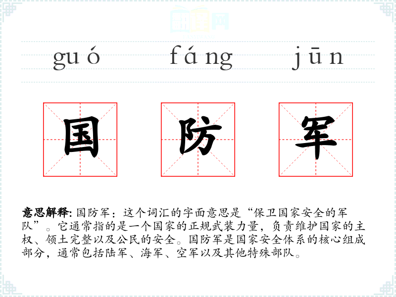 国防军:这个词汇的字面意思是“保卫国家安全的军队”。它通常指的是一个国家的正规武装力量,负责维护国家的主权、领土完整以及公民的安全。国防军是国家安全体系的核心组成部分,通常包括陆军、海军、空军以及其他特殊部队。