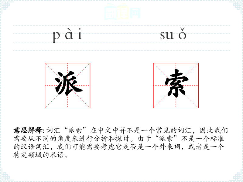 由于“派索”不是一个标准的汉语词汇,我们无法提供一个确切的定义和深入的分析。如果它是一个外来词或特定领域的术语,了解其原始语言或领域的背景可能有助于理解其含义。在语言学习和表达中,了解词汇的来源和背景是非常重要的,这有助于我们更准确地使用词汇并理解其在不同语境中的含义。