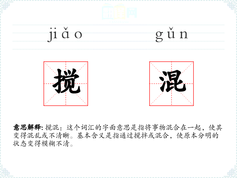 搅混:这个词汇的字面意思是指将事物混合在一起,使其变得混乱或不清晰。基本含义是指通过搅拌或混合,使原本分明的状态变得模糊不清。
