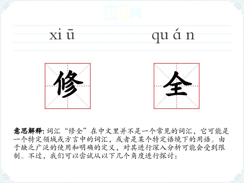 由于“修全”不是一个标准词汇,我们无法给出一个确切的基本定义。它可能是由“修”和“全”两个字组合而成的,其中“修”通常指修理、修整或修饰,而“全”则意味着完整、全面。因此,“修全”可能指的是对某物进行全面修理或修整,以使其达到完整状态。