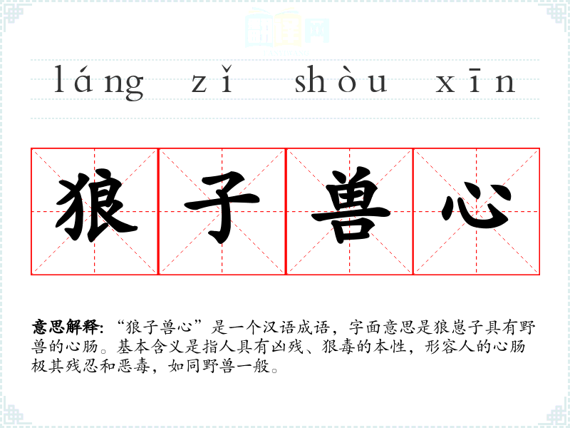 “狼子兽心”是一个汉语成语,字面意思是狼崽子具有野兽的心肠。基本含义是指人具有凶残、狠毒的本性,形容人的心肠极其残忍和恶毒,如同野兽一般。
