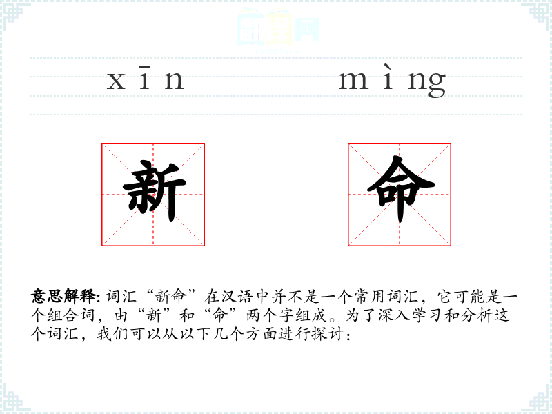 词汇“新命”在汉语中并不是一个常用词汇,它可能是一个组合词,由“新”和“命”两个字组成。为了深入学*和分析这个词汇,我们可以从以下几个方面进行探讨: