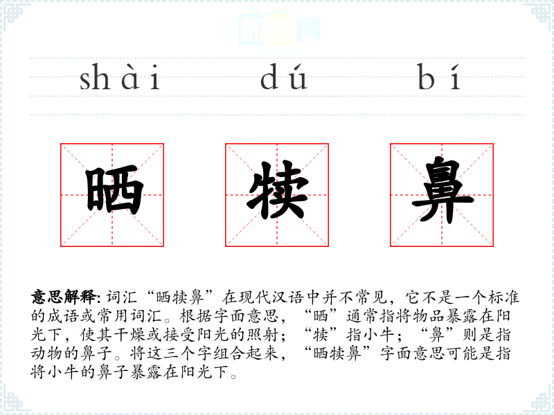 “晒犊鼻”作为一个非常特定的表达,在现代汉语中并不常用。它的字面意思是指将小牛的鼻子暴露在阳光下,但由于缺乏具体的语境和使用实例,很难对其进行深入的分析和理解。在语言学习和表达中,这个词汇可能并不具有重要性,除非在特定的文学或方言环境中。