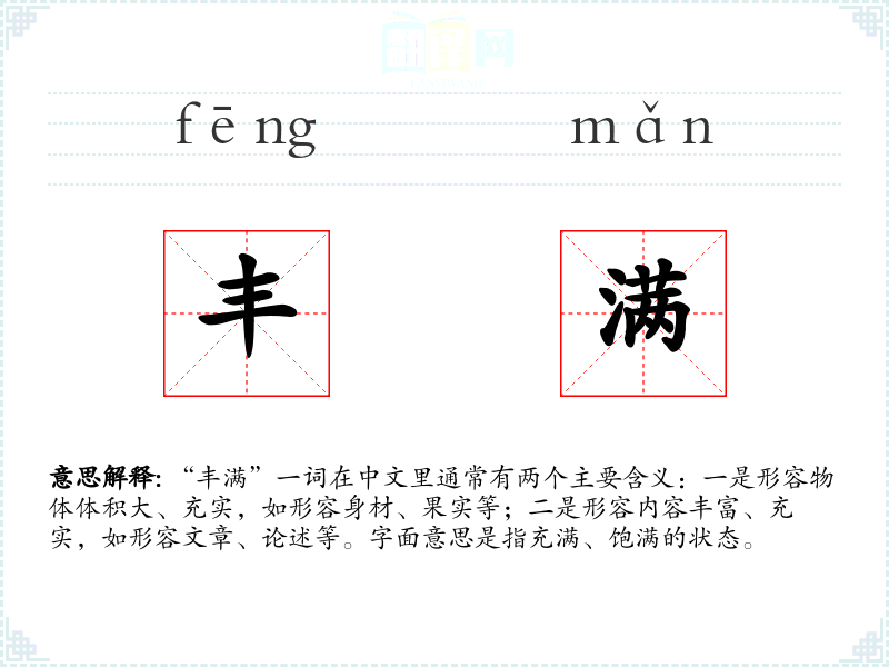 “丰满”一词在中文里通常有两个主要含义:一是形容物体体积大、充实,如形容身材、果实等;二是形容内容丰富、充实,如形容文章、论述等。字面意思是指充满、饱满的状态。
