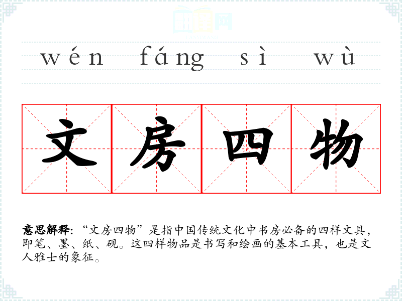 “文房四物”是指**传统文化中书房必备的四样文具,即笔、墨、纸、砚。这四样物品是书写和绘画的基本工具,也是文人雅士的象征。