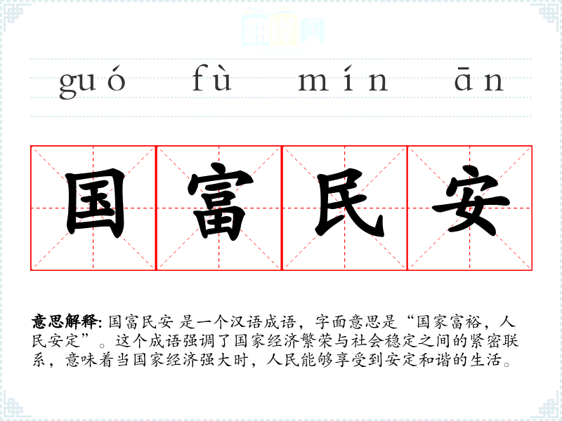 国富民安 是一个汉语成语,字面意思是“国家富裕,人民安定”。这个成语强调了国家经济繁荣与社会稳定之间的紧密联系,意味着当国家经济强大时,人民能够享受到安定和谐的生活。