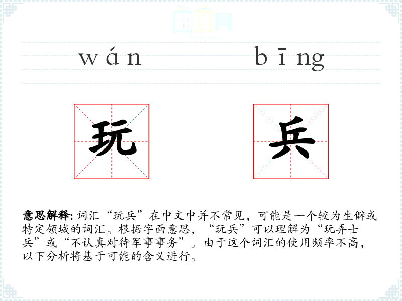 词汇“玩兵”在中文中并不常见,可能是一个较为生僻或特定领域的词汇。根据字面意思,“玩兵”可以理解为“玩弄士兵”或“不认真对待军事事务”。由于这个词汇的使用频率不高,以下分析将基于可能的含义进行。