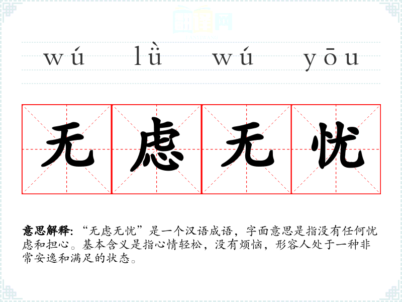 “无虑无忧”是一个汉语成语,字面意思是指没有任何忧虑和担心。基本含义是指心情轻松,没有烦恼,形容人处于一种非常安逸和满足的状态。