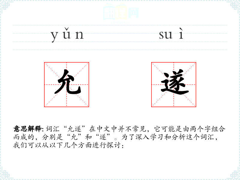 词汇“允遂”在中文中并不常见,它可能是由两个字组合而成的,分别是“允”和“遂”。为了深入学*和分析这个词汇,我们可以从以下几个方面进行探讨: