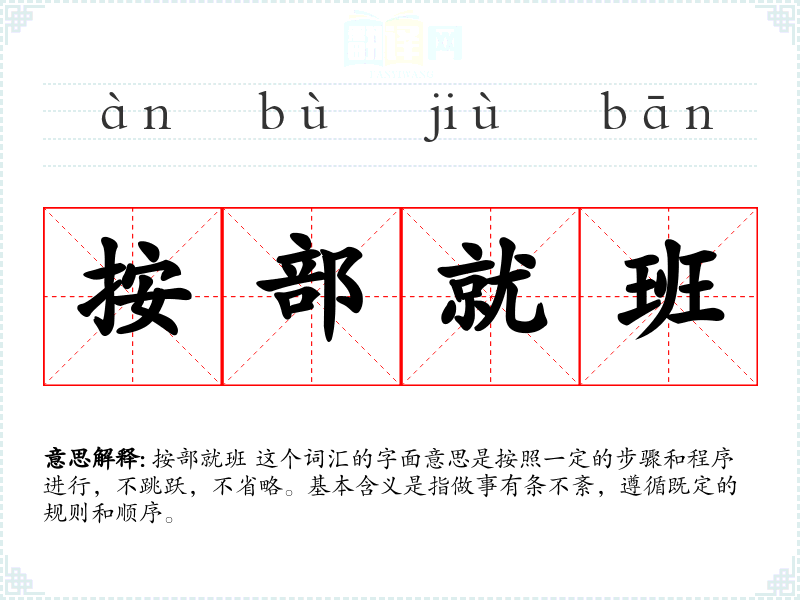 按部就班 这个词汇的字面意思是按照一定的步骤和程序进行,不跳跃,不省略。基本含义是指做事有条不紊,遵循既定的规则和顺序。