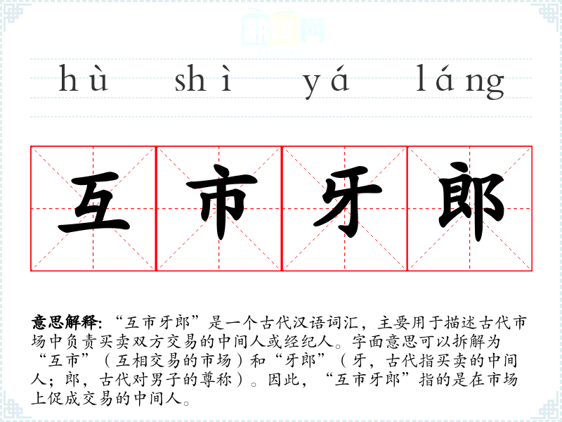 “互市牙郎”是一个古代汉语词汇,主要用于描述古代市场中负责买卖双方交易的中间人或经纪人。字面意思可以拆解为“互市”(互相交易的市场)和“牙郎”(牙,古代指买卖的中间人;郎,古代对男子的尊称)。因此,“互市牙郎”指的是在市场上促成交易的中间人。