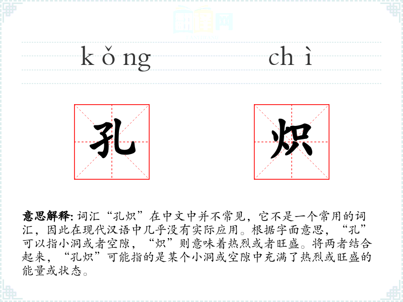 由于“孔炽”不是一个常用词汇,它的词源和历史演变难以追溯。在古代文献中可能会有使用,但在现代汉语中已经很少见。