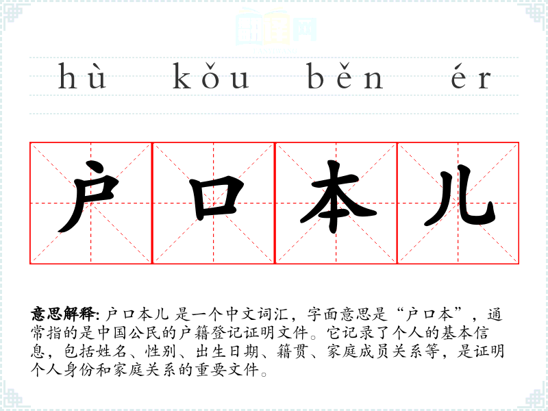 - 反义词:无(由于户口本儿是一个特定的行政文件,没有直接的反义词)