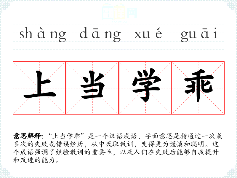 “上当学乖”是一个汉语成语,字面意思是指通过一次或多次的失败或错误经历,从中吸取教训,变得更为谨慎和聪明。这个成语强调了经验教训的重要性,以及人们在失败后能够自我提升和改进的能力。
