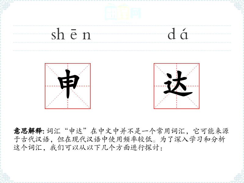词汇“申达”在中文中并不是一个常用词汇,它可能来源于古代汉语,但在现代汉语中使用频率较低。为了深入学*和分析这个词汇,我们可以从以下几个方面进行探讨: