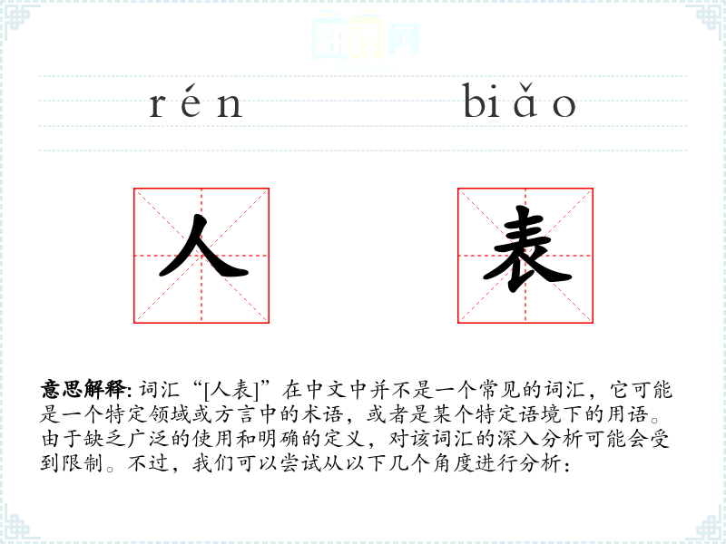 由于“[人表]”不是一个标准词汇,我们无法对其进行深入的理解和总结。在语言学习和表达中,了解和使用标准词汇是非常重要的,这有助于确保沟通的准确性和有效性。