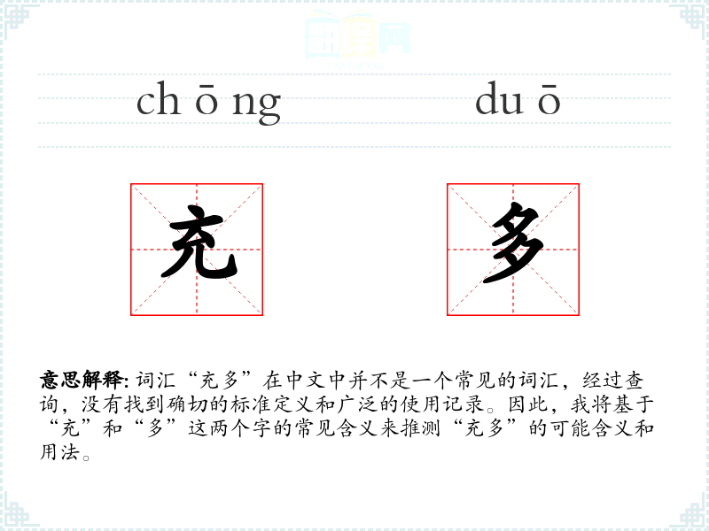 由于“充多”不是一个标准词汇,它在不同语境下的使用可能非常有限。在某些特定的行业或地区方言中,可能会有特定的含义,但这需要具体语境来确定。