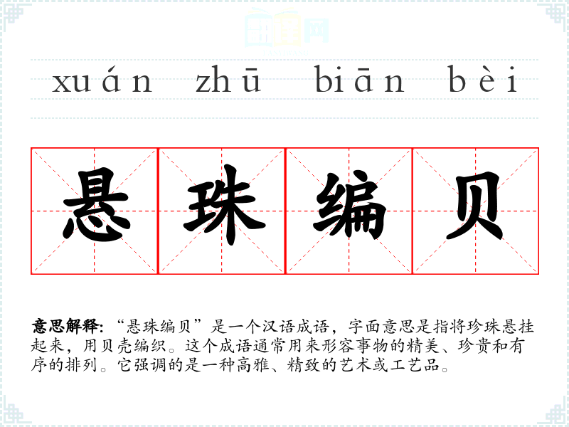 “悬珠编贝”是一个汉语成语,字面意思是指将珍珠悬挂起来,用贝壳编织。这个成语通常用来形容事物的精美、珍贵和有序的排列。它强调的是一种高雅、精致的艺术或工艺品。