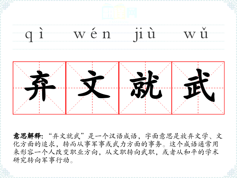“弃文就武”是一个汉语成语,字面意思是放弃文学、文化方面的追求,转而从事军事或武力方面的事务。这个成语通常用来形容一个人改变职业方向,从文职转向武职,或者从和平的学术研究转向军事行动。