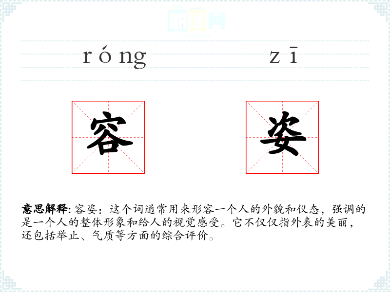 容姿:这个词通常用来形容一个人的外貌和仪态,强调的是一个人的整体形象和给人的视觉感受。它不仅仅指外表的美丽,还包括举止、气质等方面的综合评价。