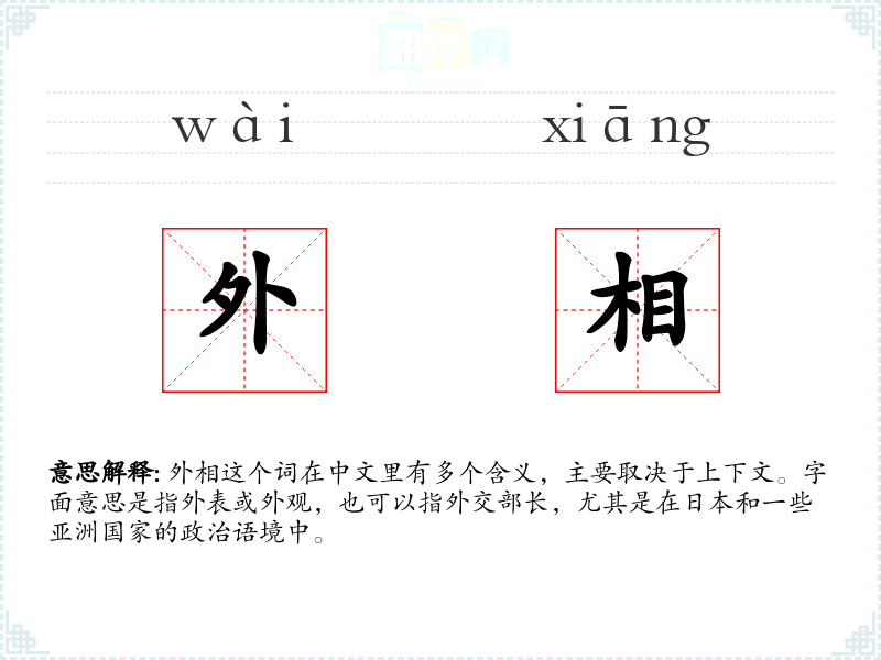 外相这个词在中文里有多个含义,主要取决于上下文。字面意思是指外表或外观,也可以指外交部长,尤其是在日本和一些亚洲国家的政治语境中。
