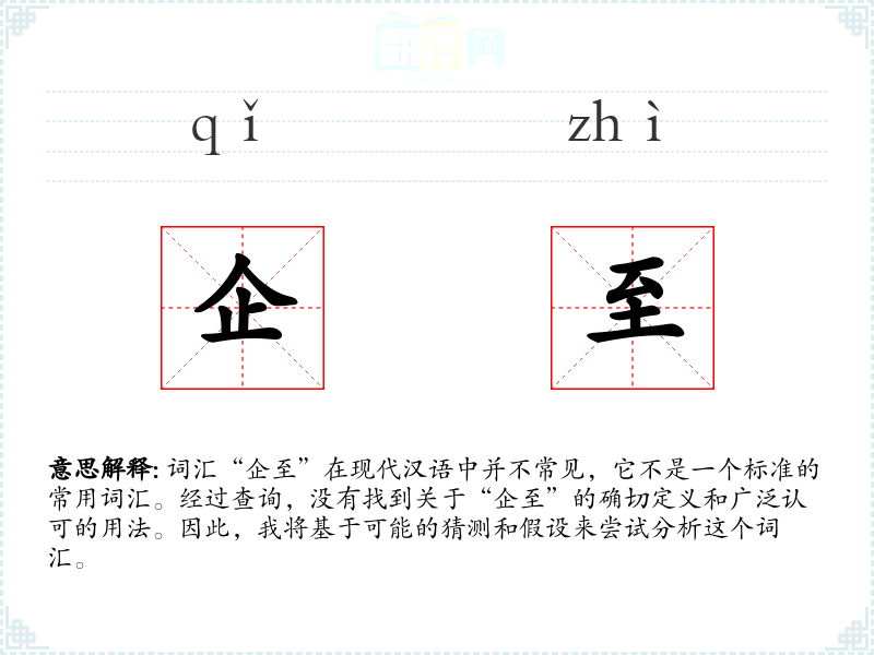 词汇“企至”在现代汉语中并不常见,它不是一个标准的常用词汇。经过查询,没有找到关于“企至”的确切定义和广泛认可的用法。因此,我将基于可能的猜测和假设来尝试分析这个词汇。