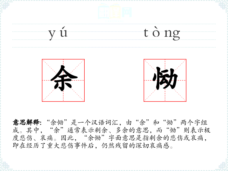“余恸”是一个汉语词汇,由“余”和“恸”两个字组成。其中,“余”通常表示剩余、多余的意思,而“恸”则表示极度悲伤、哀痛。因此,“余恸”字面意思是指剩余的悲伤或哀痛,即在经历了重大悲伤**后,仍然残留的深切哀痛感。
