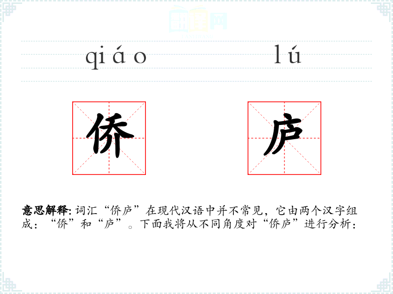 词汇“侨庐”在现代汉语中并不常见,它由两个汉字组成:“侨”和“庐”。下面我将从不同角度对“侨庐”进行分析: