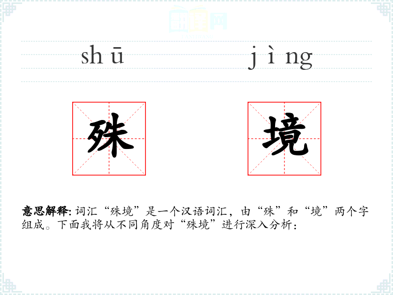 - 词源:“殊”和“境”都是古代汉语词汇,历史悠久。