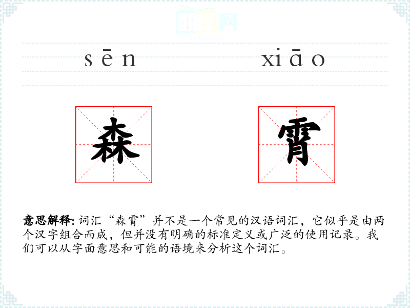 词汇“森霄”并不是一个常见的汉语词汇,它似乎是由两个汉字组合而成,但并没有明确的标准定义或广泛的使用记录。我们可以从字面意思和可能的语境来分析这个词汇。