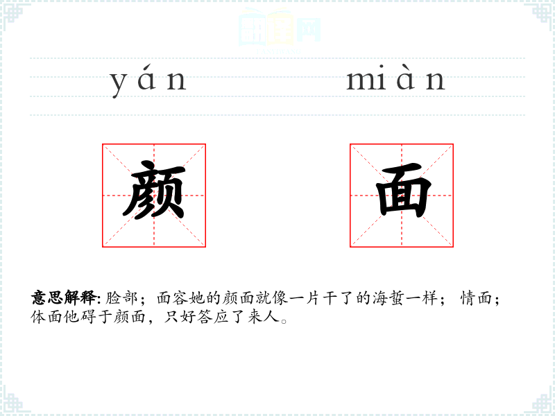 脸部;面容她的颜面就像一片干了的海蜇一样; 情面;体面他碍于颜面,只好答应了来人。