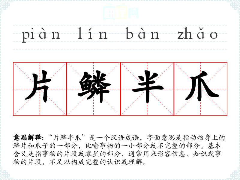 “片鳞半爪”是一个汉语成语,字面意思是指动物身上的鳞片和爪子的一部分,比喻事物的一小部分或不完整的部分。基本含义是指事物的片段或零星的部分,通常用来形容信息、知识或事物的片段,不足以构成完整的认识或理解。