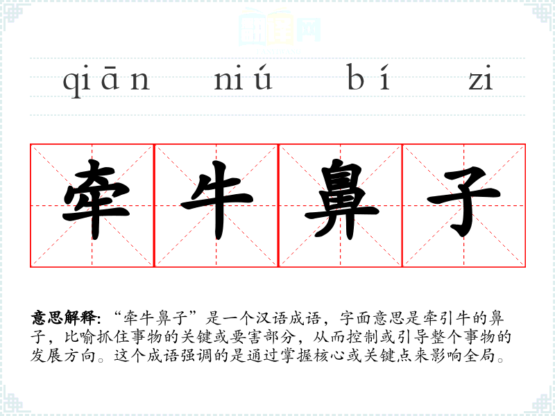 “牵牛鼻子”是一个汉语成语,字面意思是牵引牛的鼻子,比喻抓住事物的关键或要害部分,从而控制或引导整个事物的发展方向。这个成语强调的是通过掌握核心或关键点来影响全局。