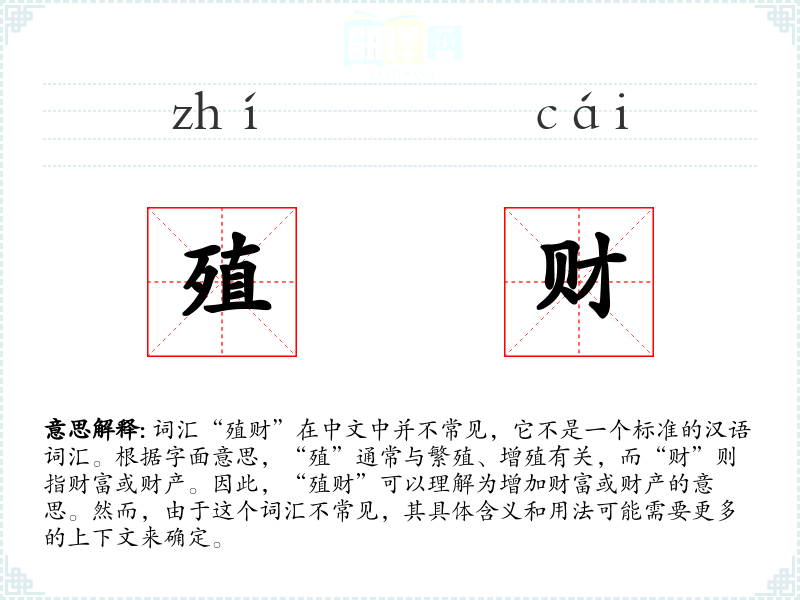 词汇“殖财”在中文中并不常见,它不是一个标准的汉语词汇。根据字面意思,“殖”通常与繁殖、增殖有关,而“财”则指财富或财产。因此,“殖财”可以理解为增加财富或财产的意思。然而,由于这个词汇不常见,其具体含义和用法可能需要更多的上下文来确定。