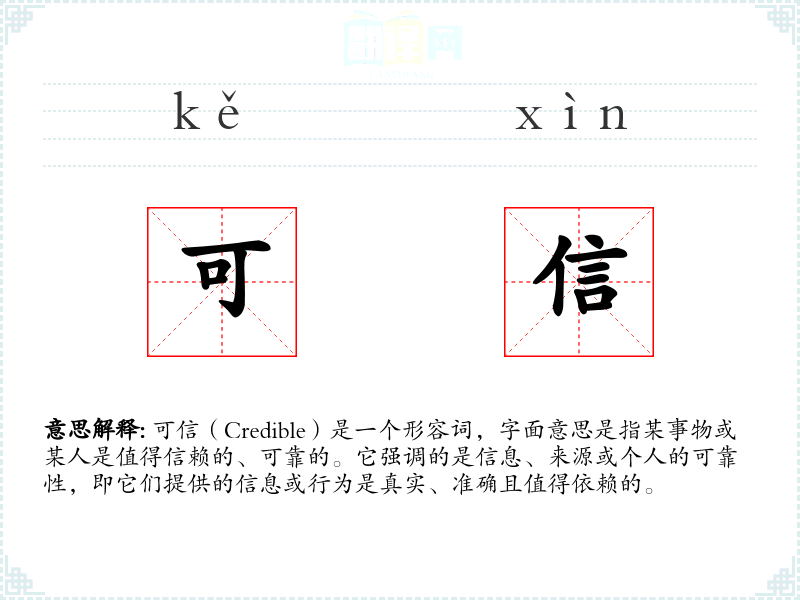 可信(Credible)是一个形容词,字面意思是指某事物或某人是值得信赖的、可靠的。它强调的是信息、来源或个人的可靠性,即它们提供的信息或行为是真实、准确且值得依赖的。
