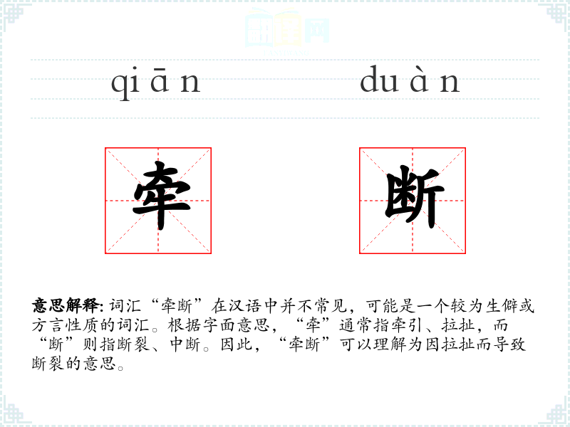 词汇“牵断”在汉语中并不常见,可能是一个较为生僻或方言性质的词汇。根据字面意思,“牵”通常指牵引、拉扯,而“断”则指断裂、中断。因此,“牵断”可以理解为因拉扯而导致断裂的意思。