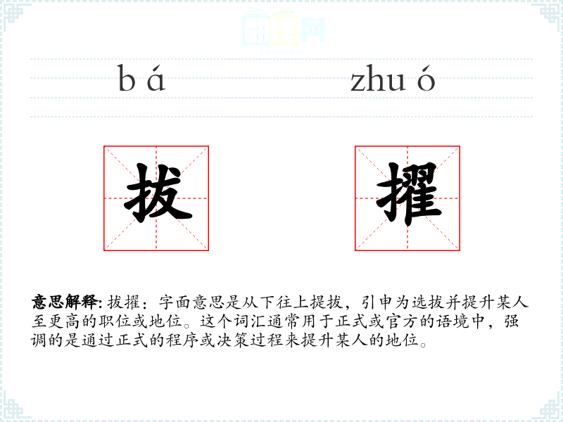 拔擢:字面意思是从下往上提拔,引申为选拔并提升某人至更高的职位或地位。这个词汇通常用于正式或官方的语境中,强调的是通过正式的程序或决策过程来提升某人的地位。