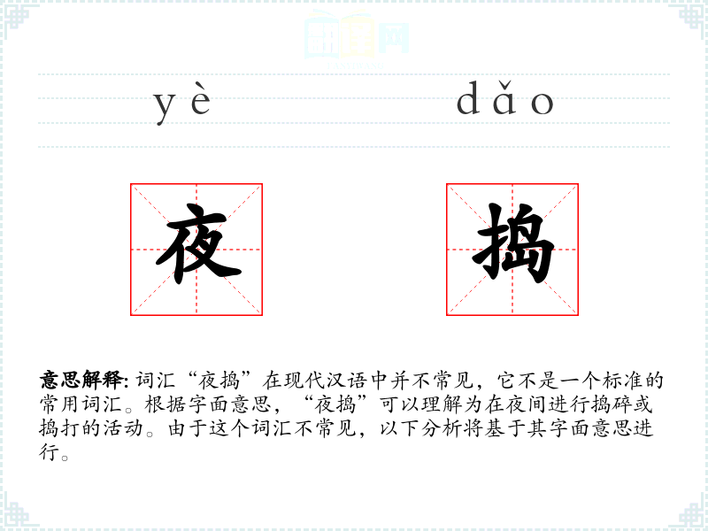 词汇“夜捣”在现代汉语中并不常见,它不是一个标准的常用词汇。根据字面意思,“夜捣”可以理解为在夜间进行捣碎或捣打的活动。由于这个词汇不常见,以下分析将基于其字面意思进行。