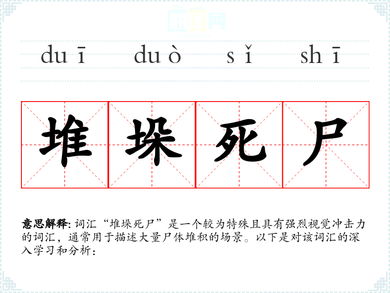 通过以上分析,我们可以更全面地理解“堆垛死尸”这一词汇的含义、用法和文化内涵,以及它在语言表达中的重要性。