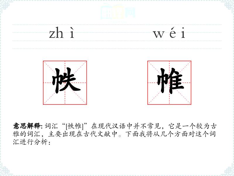 词汇“[帙帷]”在现代汉语中并不常见,它是一个较为古雅的词汇,主要出现在古代文献中。下面我将从几个方面对这个词汇进行分析: