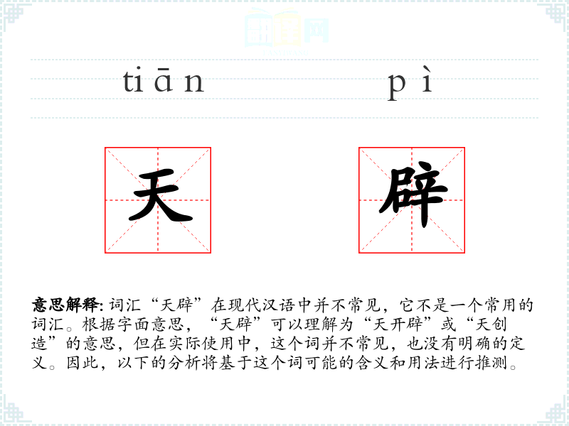 - 反义词:无(由于“天辟”不是一个常用词汇,反义词不明确)