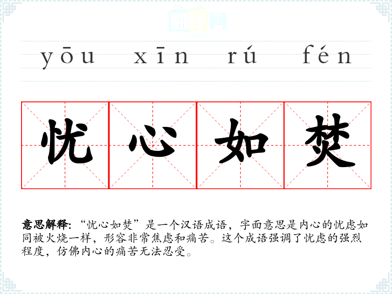 “忧心如焚”是一个汉语成语,字面意思是内心的忧虑如同被火烧一样,形容非常焦虑和痛苦。这个成语强调了忧虑的强烈程度,仿佛内心的痛苦无法忍受。