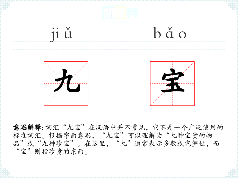 - 反义词:无(由于“九宝”不是一个常用词汇,反义词不明显)
