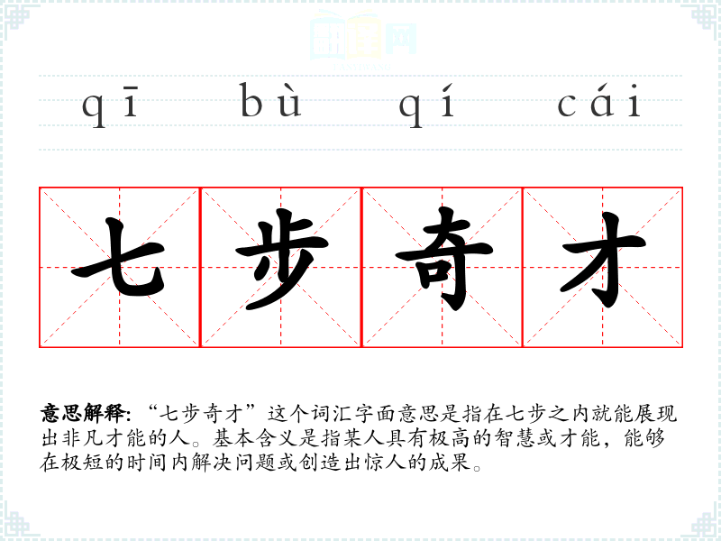 “七步奇才”这个词汇字面意思是指在七步之内就能展现出非凡才能的人。基本含义是指某人具有极高的智慧或才能,能够在极短的时间内解决问题或创造出惊人的成果。