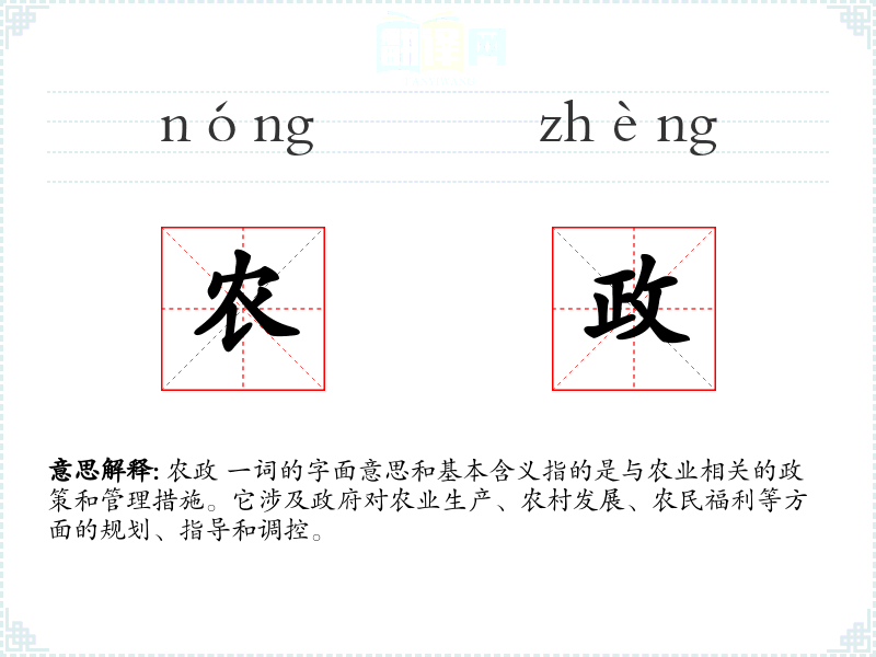农政 一词的字面意思和基本含义指的是与农业相关的政策和管理措施。它涉及政府对农业生产、农村发展、农民福利等方面的规划、指导和调控。
