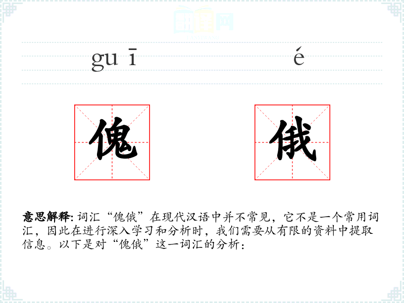 “傀俄”一词在现代汉语中并不常见,根据一些古籍的记载,它可能指的是一种木偶或者傀儡,也可能有“倾斜”或“不正”的含义。然而,由于缺乏现代使用的实例,其确切含义并不明确。