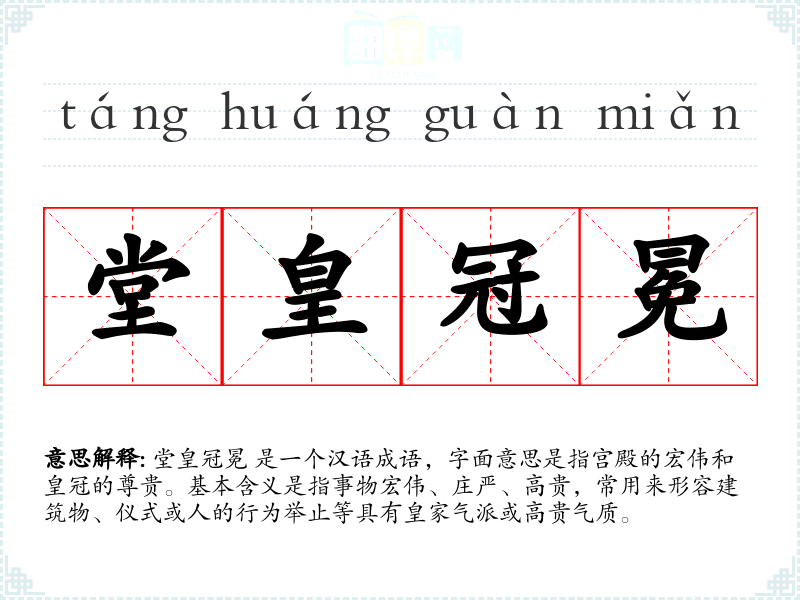 堂皇冠冕 是一个汉语成语,字面意思是指宫殿的宏伟和皇冠的尊贵。基本含义是指事物宏伟、庄严、高贵,常用来形容建筑物、仪式或人的行为举止等具有皇家气派或高贵气质。