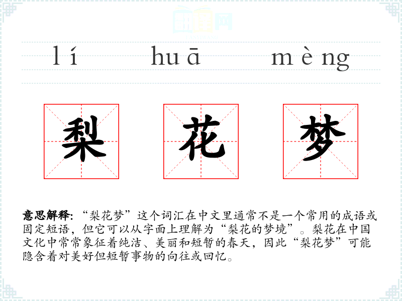 在**文化中,梨花常常与春天的到来、生命的短暂和美的易逝联系在一起。因此,“梨花梦”可能被用来表达对生命中美好但短暂时刻的珍惜和怀念。